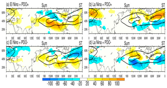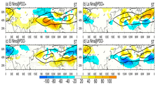 3.1. Different Combinations of ENSO and PDO and Their Impacts on Storm Tracks