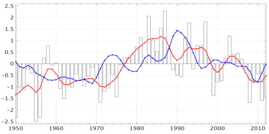 - Chelliah, M.; Bell, G.D. Tropical multidecadal and interannual climate variability in the NCEP-NCAR Reanalysis. J. Clim. 2004, 17, 1777–1803. [Google Scholar] [CrossRef]