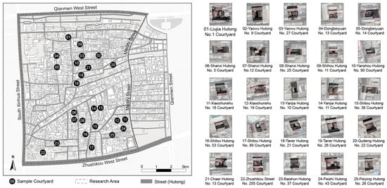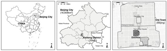 The case study is located in the Xicheng District of Beijing City, China (Figure 1). Taking the entire Dashilar area (1.26 km2) as a region for context investigation, this study has chosen the section (1.01 km2) on the west side of Meishi Street as our focus area for data collection. The targeted section covers 80.16% of the total area, which retains many traditional alleys and houses for residential use. Since the year 1420, the Dashilar area has gradually developed into historical neighborhoods with commercial, residential, and recreational functions in the central area of Beijing []. There are many rows of one-story traditional residence courtyards along narrow streets, where these courtyards are called Siheyuan and the streets are known as Hutong. After the foundation of the People’s Republic of China, most of the housing properties in the Dashilar community were taken into state ownership, and each one-door,-one-family courtyard was rented to more than one household in response to the housing shortage caused by the large growth of the new population and new immigrants at that time. This decision has resulted in the courtyard spaces changing from private to public, which, together with the street public spaces, compose the main body of the public spaces related to the Dashilar area. Meanwhile, Dashilar’s residents began to convert traditional one-story buildings into multi-story buildings without permission and illegally occupy public spaces to build residential houses, resulting in high density and overuse that accelerated the aging and deterioration. Thus, similar to many historical communities in China, Dashilar is currently facing the challenge of preservation and development.