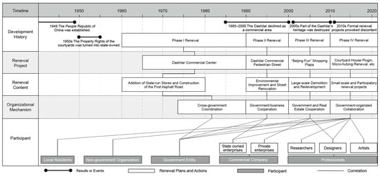 Timeline of the four-phase renewal of the Dashilar community, Beijing, China.