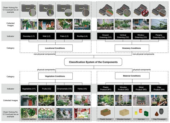 Based on the sampling and investigation, the components of community gardens driven by the residents of the Dashilar community were studied from four aspects: location condition, greenery condition, vegetation condition, and material condition, and these components were basically covered in these conditions. Specifically, the non-physical components were included in locational conditions and greenery conditions, which mainly refer to the spatial layouts and forms of these gardens, and these cannot usually be measured precisely; the physical counterparts were assigned in vegetation conditions and material conditions, which largely concern the plants and articles used by the residents to construct these gardens, and these can be counted in quantity. Although some of the components fell under the same condition, our classification results show that distinct differences exist between them, which means that these four categories can be further divided into different indicators in Figure 5.