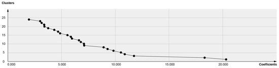 Hierarchical cluster analysis (HCA) is a general approach to cluster analysis that has two main categories of methods to build a hierarchy of clusters, including divisive and agglomerative methods. In this study, agglomerative hierarchical clustering (AHC) was utilized via SPSS Statistics 29.0 from IBM’s software to obtain the clustering results of the 25 samples: first, given that only the vegetative and material indicators were quantified, which extracted from the resident-led community gardens, were taken as the variables and their data of the 25 samples were entered; next, the skewness-kurtosis normality test provided by SPSS Statistics 29.0 software was performed to determine whether these variables follow normal distributions; last, since the surface area of each sample did not differ much, each sample was clustered with the same weight and the clustering results were obtained presented in a hierarchical clustering dendrogram after validation, which is achieved by means of the Euclidean square distance used as the distance measure and the between-group linkage that specifies the distances between two clusters []. In addition, the clustering coefficients are calculated to identify the appropriate numbers of clusters. The distance  between a point  and a point  in -dimensional Euclidean space is: