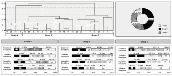 For a small number of samples, less than 50, the absolute z-scores for either skewness or kurtosis are not larger than 1.96; the distributions can be considered normal (Table A2). Then, the AHC analysis was run by SPSS Statistic 29.0 software. Finally, the clustering results were presented in a dendrogram. To determine the appropriate number of clusters, we calculated and obtained the clustering coefficients for this AHC analysis. As can be seen from Figure 6, when the number of clusters is 3, this curve of clustering coefficients tends to slow down, and the interval between the points becomes larger, which means that heterogeneity between the clusters increases. Therefore, the informal community gardens in the 25 samples were finally classified into three types, named group A, group B, and group C (Figure 7). Among them, group B has the highest number of samples, three times that of group A at 48%, followed by group C at 36%.