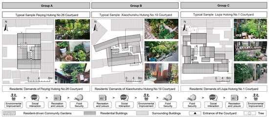 Although it shows that the residents’ needs are taken into account in the selection and application of the components in the previous results, the statistical results on proportions of the indicators in each type further demonstrate the main needs of the target users and the differences in the priority of the residents’ needs behind the different types (Figure 7). For example, in terms of vegetative conditions, Group A had more samples of ornamental and fruit plants than others with 29.85% and 26.87%, respectively; Group B had significantly more ornamental and vegetable plants with 40.46% and 32.82%, respectively; Group C had overwhelmingly more vegetable plants with 40.89%. In addition, based on our field mapping and non-participatory observation, three typical samples were analyzed as case studies for supplementary illustration (Figure 8).