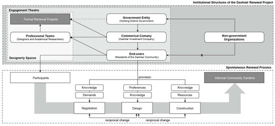 Grassroots innovation refers to bottom-up organizational mechanisms for community development and renewal, which are often initiated by the residents who identify the community’s issues and seek solutions with the participation and collaboration of other stakeholders []. Currently, grassroots innovation has been considered one of the significant community-based organization mechanisms by the Chinese government to achieve community sustainability for the reason that it can contribute to strengthening relationships between people and their ability to shape more sustainable communities []. In this context, informal community gardening is expected to be a stepping stone to inspire the grassroots innovation of historical communities by retaining the empowerment and full participation of residents and further involving diverse actors. Therefore, this bottom-up pathway needs to be integrated with the broader institutional structures of the Dashilar community, which can lead to a combination of top-down and bottom-up approaches to promote the renewal of public space in Chinese historical communities.