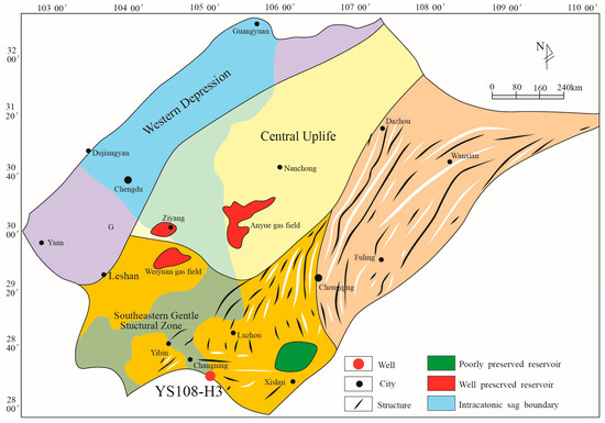 The YS108-H3 horizontal well group studied in this paper is located in the southern margin of the low and steep fold belt in southern Sichuan in the Sichuan platform downwarp, adjacent to the Dianqianbei Depression (Figure 1). This horizontal well group is located in the southern flank of the Jianwu anticline. The strata of the axis part are Jurassic strata, and the wing is composed of the Triassic Leikoupo Formation, Jialingjiang Formation, Tongjiazi Formation, and Feixianguan Formation (Figure 2). The strata have gentle production conditions, a stable distribution, and a mild structure, which are conducive to the preservation of shale gas [33]. The well was drilled in the Lower Silurian Longmaxi Formation using a 139.7 mm OD casing (Figure 2). The well has a depth of 4210 m, with a maximum slope angle of 84.25°, and the length of the horizontal section is 1655 m [34].