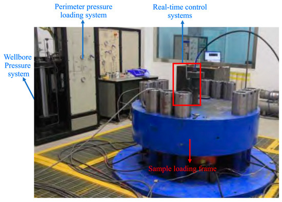 The experimental fracturing system consisted of a sample loading frame, wellbore pressure system, confining pressure loading system, and real-time control system (Figure 3). The loading frame had a circular structure, allowing for a maximum rock sample size of 762 mm × 762 mm × 914 mm (length × width × height), effectively reducing the dynamic effects of fracture initiation and the influence of stress boundary effects [35]. The triaxial confining pressure was applied using loading pressure plates placed in the gap between the rock sample and the frame. The fracturing fluid was injected into the pressure plates, causing them to expand and transmit the fracturing fluid pressure to the rock sample’s surface, simulating the in situ stress conditions, with a maximum pressure of up to 69 MPa [36]. The wellbore pressure system was controlled by a hydraulic servo system, with a maximum injection rate of 200 cm3/s and a maximum pump pressure at the wellhead of 82 MPa [36]. The real-time control system recorded the wellhead pressure, pump displacement, and triaxial confining pressure data in real time and adjusted the pump rate according to the experimental conditions [37]. Additionally, to visually observe the fracture morphology, red or blue colorants were mixed into the injected fluid [38].