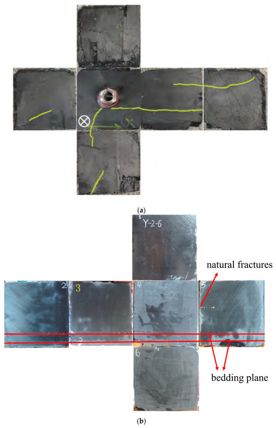 Pre-fracturing dissection diagram of the shale sample utilized in the hydraulic fracturing test. (a) Specimen from well X1 before hydraulic fracturing; and (b) specimen from well X2 before hydraulic fracturing.