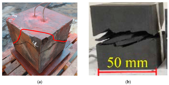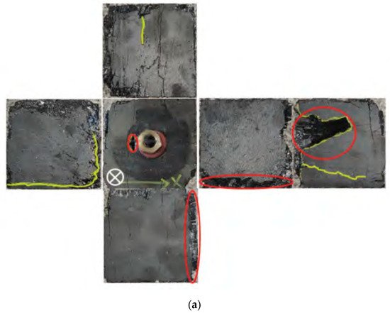 By observing the fractured specimens, it was found that the hydraulic fracturing fluid flowed out of the two faces in the direction of the applied vertical stress (Figure 35). It can be inferred from this observation that the fractures propagate and extend outward in a bimodal pattern. Therefore, it is expected that secondary fractures have formed in the seam, and they not only propagate longitudinally but also extend continuously in the horizontal direction within the seam.