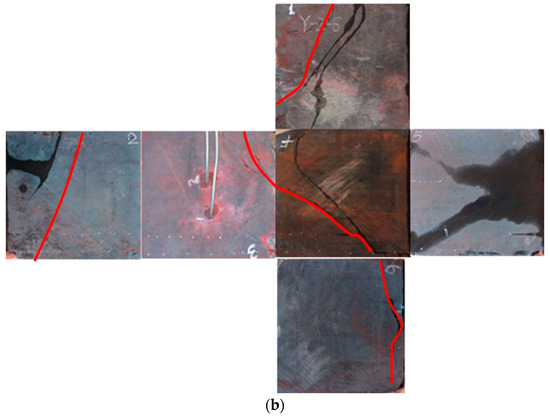 Post-fracturing dissection diagram of the shale sample utilized in the hydraulic fracturing test. (a) Specimen from well X1; and (b) specimen from well X2.