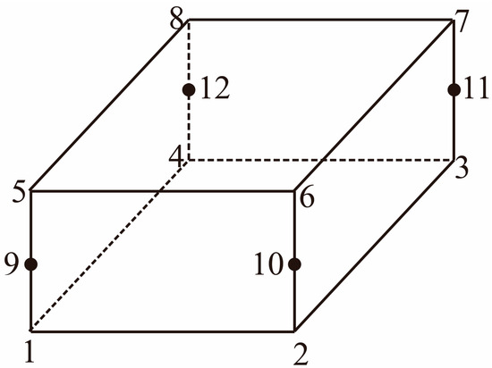 Cohesive elements, also known as cohesive zones, were used to simulate and study the propagation of two-dimensional/three-dimensional fractures by inserting a layer of cohesive elements along the path of the fracture expansion [42]. As shown in Figure 7, although the cohesive elements had a top surface (5, 6, 7, and 8), a middle surface (9, 10, 11, and 12), and a bottom surface (1, 2, 3, and 4), they were considered to be a layer with zero thickness. The damage status of the cohesive elements was determined based on the fracture criteria [43]. When the damage criterion was satisfied, cohesive elements began to experience damage. When the cohesive elements completely failed, they split the middle layer in two, thereby forming a fracture [44].