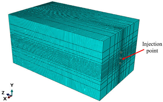 The target layer and interbed layer were meshed with C3D8P elements (eight-noded hexahedron, three-directional linear displacement, and three-directional linear poroelasticity). The cohesive elements were modeled with COH3D8P elements (12-noded three-dimensional poroelasticity cohesive element). The mesh was refined in the Y- and X-directions, where the fracture initiated, and the mesh was denser near the initiation point. The Z-direction was uniformly meshed along the fracture length. A total of 28,000 elements were generated in the entire computational model [54].