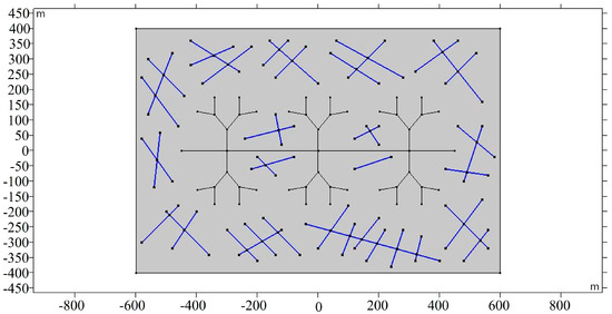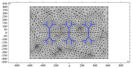 During the fracturing process, a high-pressure pumping unit injects fracturing fluid at a high displacement and pressure into the shot hole location of the wellbore’s target formation. When the fracturing fluid generates a transient holding pressure at the shot hole, which is consistent with the strength of the rock near the wellbore’s target formation, as well as the reservoir’s geostress field, the rock formations around the wellbore begin to rupture, and the cracks or the already existing natural cracks begin to expand. As the fracturing process proceeds, the fracturing fluid flows forward along the fractures, and the fractured fractures continue to expand. When the length of the fractured fractures reaches the construction requirements, the sand-carrying fluid is pumped into the wellbore, and the next step is to start injecting large quantities of fracturing fluid into the wellbore of the formation. At this time, the part of the fracturing fluid injected into the wellbore reacts with the original fracturing fluid in the wellbore and the destination layer, and the reaction occurs in the wellbore or the destination layer, thus causing the fracturing fluid to break down and the original part of the fracturing fluid to break down. The viscosity of the original part of the fracturing fluid starts to decrease. In the end, only the proppant is left in the fracture, which is used to prevent the fracture from closing in a later stage, thus forming a connecting channel with a high conductivity, reducing the seepage resistance for oil and gas transport, increasing the flow of oil and gas resources from the far field to the low-pressure zone of the wellbore, and increasing the production of the oil and gas wells. The simulation of the hydraulic fracturing process revealed that the real fractures are characterized by uncertain and extremely complex geometrical rules, which are difficult to express using mathematical formulae. This is an obstacle to the simulation of fracture extension. At present, most of the research conducted in China and abroad has been confined to ideal fractures, i.e., assuming that the fracture is elliptical along the fracture length and fracture height, and the phenomenon of fracture penetration was not taken into account, which is convenient for mathematical expression of the fracture morphology and derivation of the seepage and stress equations. According to the outcrop statistics, core description, and imaging logging interpretation results for the Wufeng–Longmaxi Formation shale in the Sichuan Basin, the natural fractures in the reservoir in well YS108 are mainly laminar and tectonic fractures. The laminar fractures have a smaller inclination angle and higher fracture density than the tectonic fractures, which have a larger inclination angle and lower degree of development. The simulated model represents a two-dimensional vertical cross section of a horizontal well in a shale formation (Figure 9). The objective of this model is to simulate the morphology and characteristics of hydraulic fractures propagating within the plane perpendicular to the rock formation in the horizontal well (Figure 9).