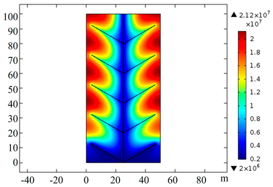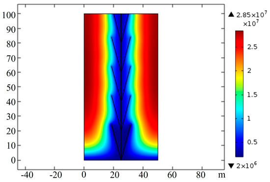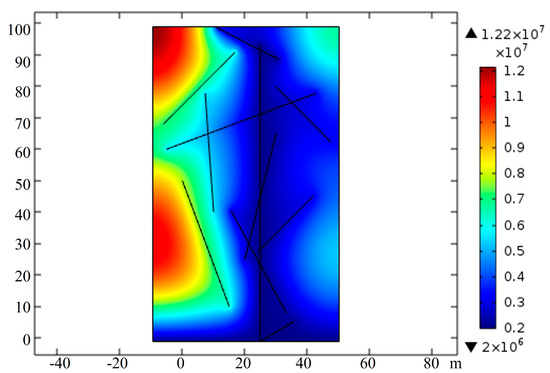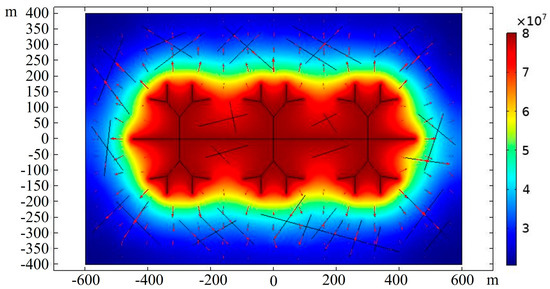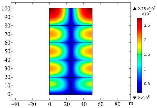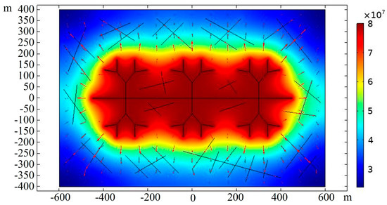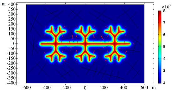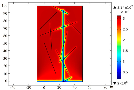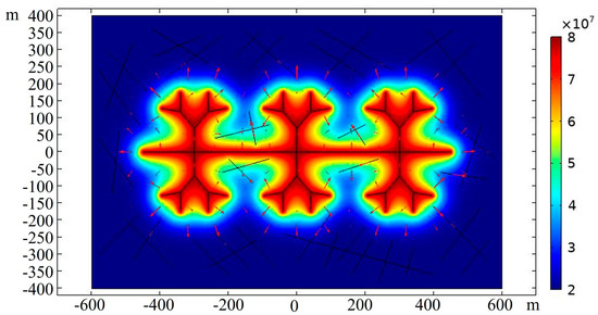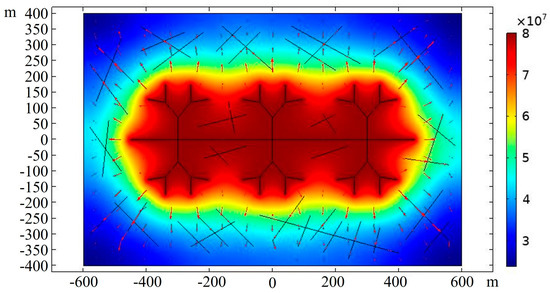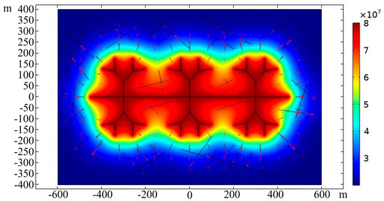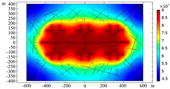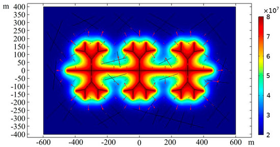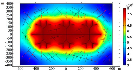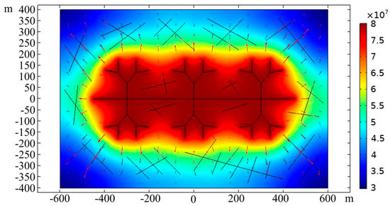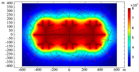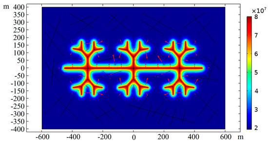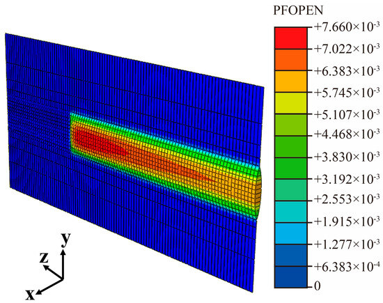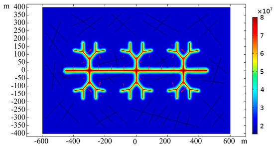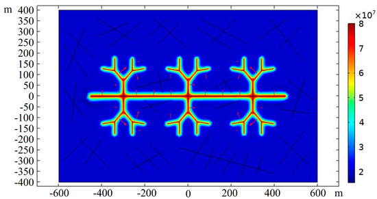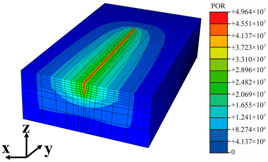 After the completion of the hydraulic fracturing, the pore pressure distribution cloud map of the fracture revealed a concentrated high-pressure situation within the fracture (Figure 11), whereas it revealed a stepped distribution around the fracture and an elliptical distribution near the fracture tip. This is because the permeability of the reservoir was greater than that of the barrier, and the corresponding flow rate of the fluid that filtered into the reservoir was larger than that of the fluid that flowed into the barrier, resulting in a lower pore pressure on the surface of the barrier fracture than on the surface of the reservoir [55].