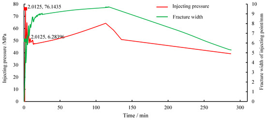 The pore pressure at the injection point initially increased and then decreased before stabilizing over time. The fracture width at the injection point gradually increased in a curve pattern, fluctuating slightly after the fracture initiation and reaching the maximum width before gradually decreasing and stabilizing.