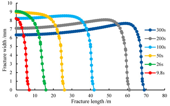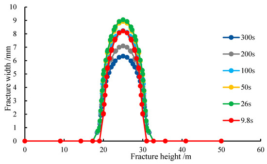 During the early stage of hydraulic fracturing, due to the difference in the formation stresses and elastic moduli, the fractures initially propagate in the target layer. From 0 to 8 s, both the fracture length and height change, and the height remains unchanged from 8 to 10 s, whereas the length changes. At 10 s, the fracture breaks through the upper and lower barriers (Figure 37a), and both the fracture height and length change from 10 to 13 s. From 13 to 300 s, the fracture height remains unchanged, whereas the length continues to change. As the hydraulic fracturing fluid continues to be injected, the pore pressure continues to increase. Although there is not a significant difference in formation stresses and elastic moduli between the target and barrier formations, when the pore pressure increases sufficiently to overcome the resistance to fracture extension in the vertical direction, the fracture breaks through the upper and lower barriers.