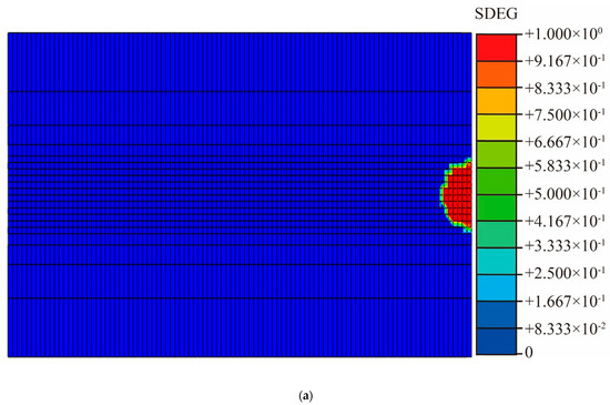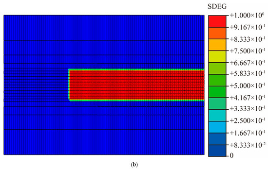 where represents the tensile stress that the cohesive element can bear, and represents the compressive stress that the cohesive element can bear. are the normal stress components and two tangential stress components that the element bears in the current situation; and and are the normal stress component and tangential stress components of the element calculated under linear elastic conditions before material damage occurs [49].