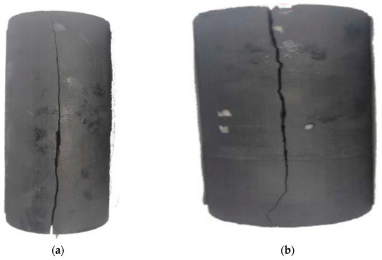 To better observe the extension and propagation of the fractures within the entire wellbore section of the hydraulic fracturing specimen, we cut the post-fracture specimen along the direction parallel to the wellbore. From the cross section of the specimen, it was observed that the fractures traversed the entire specimen (Figure 4). The results of the indoor hydraulic fracturing simulation experiment are presented in Figure 5. To observe the extent of the fracture propagation in the cross section more accurately, the specimen was cut into two parts, as shown in Figure 6.