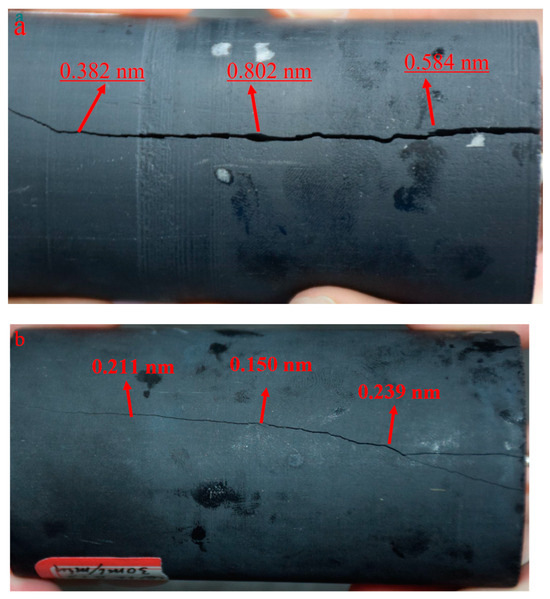 To investigate the influences of different injection volumes of fracturing fluid on the widths of the primary fractures in the shale, quantitative analysis of the widths of the primary fractures on the specimen surfaces was conducted. The results are shown in Figure 39, which presents a comparison of the widths of the primary fractures after hydraulic fracturing. Figure 39a provides a magnified view of the morphology of the primary fractures on the surfaces of the shale specimens. For ease of comparison, each image is annotated according to a certain scale. After hydraulic fracturing, the width of the primary fractures on the surface of specimen 1-1 was within the range of 0.382 to 0.802 mm, with maximum fracture widths of 0.802 mm and 0.239 mm, i.e., a decrease of 70.19% in the maximum fracture width. This indicates that as the injection volume of the hydraulic fracturing fluid increased, the range of the primary fracture width on the surface of the shale specimens decreased.