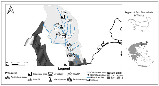 The study area is the lesser-studied and monitored basin of Laspias River, a river situated in Xanthi Prefecture, Thrace Water District, Greece. The river is about 30 km in length with gentle slopes, regulated (and delineated) in its entire route, and covers an area of approximately 212 km2. It has tributaries with ephemeral flow and receives a significant amount of water from the adjacent basin of Nestos River. Laspias flows among agricultural areas without riparian vegetation in its major part [38]. It discharges in an area protected by the Ramsar Convention on Wetlands of International Importance, while the river’s lowlands are included in the NATURA 2000 network (GR1150001, GR1150014). The climate is continental with Mediterranean characteristics. The river’s water is primarily used for agricultural irrigation, as the area is dominated by intensive agriculture [38,39]. Beyond agricultural runoffs that constitute a non-point pollution source, several point pressures complement this effect [39]. Its upstream part runs through a military field and then crosses a landfill (Figure 1). Moving downstream, the main tributary receives the effluents from animal husbandry farms and some tributaries contribute, having received effluents from the wastewater treatment plant of Xanthi and the industrial park (Figure 1). All these constitute a network of stressors upon the biota of the river ecosystem. In addition to its importance, the river received little attention until recently concerning monitoring and restoration/mitigation measures.