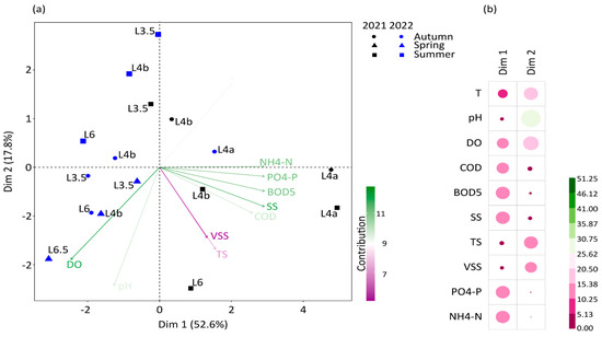 (a) Results of Principal Component Analysis (PCA) of parameters related to water quality and (b) the contribution of each parameter of the first two dimensions of the first two PCA axes.
