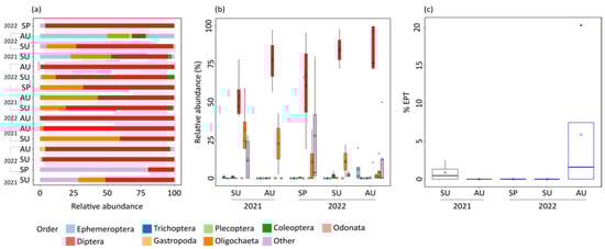 We recorded a total of 24,527 individuals (4370 individuals in 2021 and 20,157 individuals in 2022), belonging to 19 orders (10 orders in 2021 and 17 orders in 2022) and 38 families (23 families in 2021 and 34 families in 2022) in the sampling sites in both years. Among them, the non-native species Branchiura sowerbyi (Beddard, 1892) was recorded for the first time. The order Neotaenioglossa was recorded only in 2021, and the orders Amphipoda, Hemiptera, Heterostropha, Megaloptera, Sphaeriida, Trichoptera, Tricladida and Trombidiformes were recorded only in 2022. The most diverse order was Diptera (2021: 5 families and 2022: 8 families), which showed the highest relative abundance in almost all seasons and years (Figure 3a,b). Although the order Coleoptera was represented by seven families in 2022, all the families were of low abundance. Similarly, the EPT abundance was lower than 10% of the total abundance (Figure 3c) but in one site in autumn 2022 (L6, approximately 20%).
