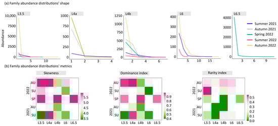 (a) Family abundance distribution per site, season and sampling year and (b) metrics of abundance distributions in River Laspias during research period.