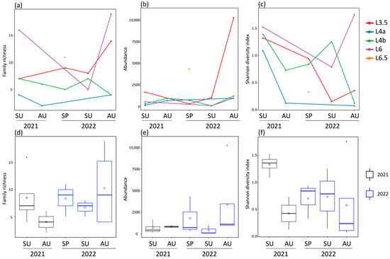 The mean family richness per site was equal to 8.6 families (2021: 8 families and 2022: 7 families). Abundance per site ranged between 85 and 10,315 individuals, with the minimum and maximum values recorded in the summer and autumn of 2022 (Figure 5a). The highest family richness per site (19 families) and higher value of the Shannon diversity index were observed in a site in the autumn of 2022, namely site L4a (Figure 5a,c). However, communities tended to be more diverse in the summer of the first sampling year (Figure 5c). Inspection of seasonal patterns confirmed that communities were, on average, richer and had more individuals in autumn 2022 but were more diverse in summer 2021 (Figure 5d–f).