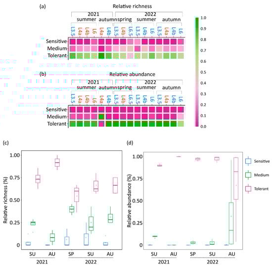 According to the habitat matrix, habitats’ sites changed across seasons and years in most cases (Figure 6a,b). Yet, site L3.5 was categorized as rich in all seasons and both years. Furthermore, the habitats of all sites were as rich as in the summer of 2022. The pollution-tolerant taxa prevailed in terms of richness and abundance in all sites and across seasons, even in sites indicated as rich by the habitat matrix (Figure 6c,d).