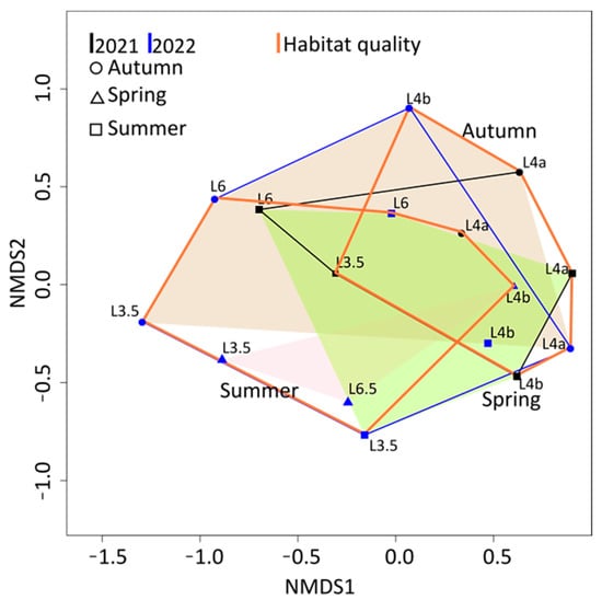 Non-metric multidimensional scaling (NMDS; with the abundance-based Bray–Curtis index) ordination was applied using R package vegan [52] to pinpoint differences in the composition of communities across seasons, years and stations with different habitat quality. Furthermore, seasonal and year-by-year differences and effects of PCAenv1 and PCAenv2 via the envfit function of the R package vegan were tested. Next, we estimated the pairwise abundance-based Bray–Curtis and presence/absence-based Jaccard similarity index within a year and between years. To map spatial and temporal β-diversity, we compared the values of the following categories: between sites within season per year, within site between seasons per year, within site between seasons and years and within site within season between years.