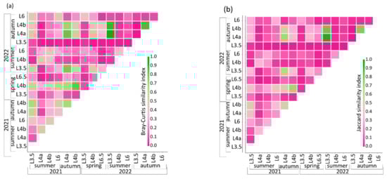 Regarding the composition of communities, the results of NMDS showed just a rough differentiation of benthic communities among seasons and sampling years, but sites were differentiated based on habitat quality (Figure 7). The envfit results confirmed that year and season did not have a significant effect on variation in the family composition of benthic communities. However, idiosyncratic characteristics of the site (site ID) were associated with benthic communities. Focusing on pairwise results of β-diversity values, it showed that communities within the site were similar across seasons in the second sampling year, and this also applies to spatial β-diversity (across sites within season). Overall, temporal differences in family composition emerged within the site and season between years (Figure 8). The differences were more pronounced in the case of the Bray–Curtis similarity index than in the Jaccard index, suggesting that differences in the relative abundances of the taxa contributed to differentiations.