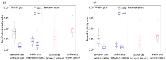 Summary plot of β-diversity patterns across seasons and years: (a) pairwise values of β-diversity quantified by the abundance-based Bray–Curtis and (b) presence/absence-based Jaccard similarity indices. Boxplots showing mean spatial β-diversity per year and mean seasonal temporal β-diversity within year (along with the distribution of values) and temporal β-diversity within year and season with the (c) Bray–Curtis and (d) Jaccard similarity indices. Solid lines and diamonds indicate median and mean values, respectively, boxes represent inter-quartile ranges (25–75%), outer lines the highest and lowest values and dots the outlier values.