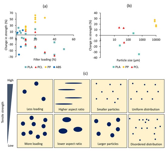 | Polymer | Filler Size (µm) | Filler | Amount | Tensile Strength (MPa) | Modulus (MPa) | Elongation at Break (%) | Reference |