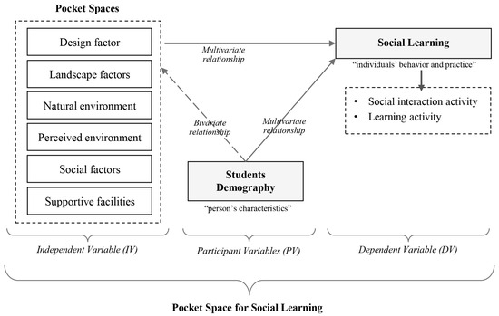 The present study’s theoretical basis was established based on an intensive review of previous studies and distinguished theories in the context of social learning and its environments (Figure 2). The existing body of knowledge provides evidence on the possible types of factors affecting users of nearby pocket settings, such as design factors [2,3], landscape factors [26,42], social and human factors [6], and natural and perceived environmental factors [14,43].