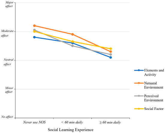 Moreover, the descriptive statistics obtained from the present study indicated that a significant proportion of students exhibited a deficiency in engaging in diverse social learning activities in the nearby pockets located on campus grounds. The mean comparison showed that the elements and activities, natural environment, perceived environmental factors, and social factors on tropical campus grounds led to a lack of use of the nearby pocket for social learning (Figure 5). The findings of the descriptive analysis indicated that a majority of the students exhibited a limited utilisation of the current adjacent pockets, either by not utilising them at all or by utilising them for less than 60 min per day for on-campus activities.