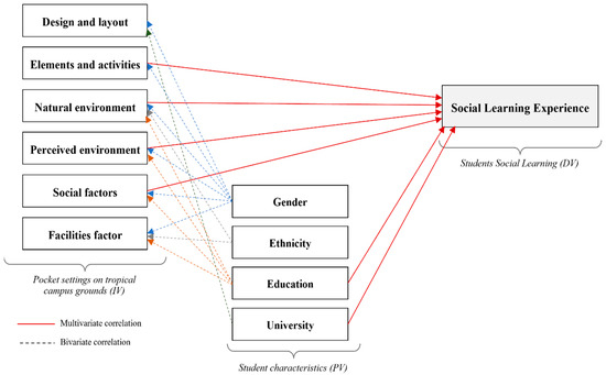 These results indicated that various factors, including elements and activities (softscape, hardscape, sense elements, and activities), natural environment factors (temperature, rain and humidity, sunlight, and shade), perceived environment factors (management and maintenance and safety and security), and social factors (existence of others and participation in socialisation), were found to predict the social learning experience on tropical campus grounds. Figure 4 demonstrates a negative correlation between the social learning experience and these factors. This result indicated a correlation between the lack of social learning experience of students in nearby pockets on tropical campus grounds and elements and activities, the natural environment, perceived environmental factors, and social factors. In other words, the negative physical, environmental, and social factors on tropical campus grounds led to a lack of use of the nearby pocket for social learning.