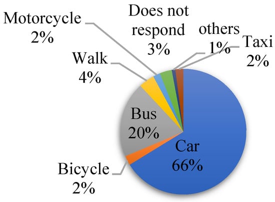 The survey incorporated questions tailored to shed light on the respondents’ vehicular usage patterns and their charging preferences should they own an EV. When asked, “What type of transport do you use daily?”, 66% of participants predominantly answered that they use their personal vehicles, whereas 20% use public transportation. This data accentuates the prevailing reliance on personal vehicles as the chief mode of transportation in Cuenca. A graphical representation of the most commonly used transport methods is depicted in Figure 1.