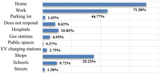 Finally, in response to the question “What would be the preferred place to charge EVs?”, 71.38% of the surveyed population indicated a preference for charging EVs at their homes, while the remainder favored charging at their workplaces. These findings are summarized in Figure 3.