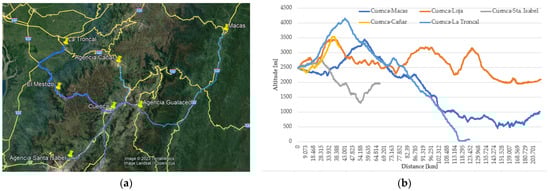 Cuenca main routes: (a) location and route (Source: Google Earth); (b) elevation.