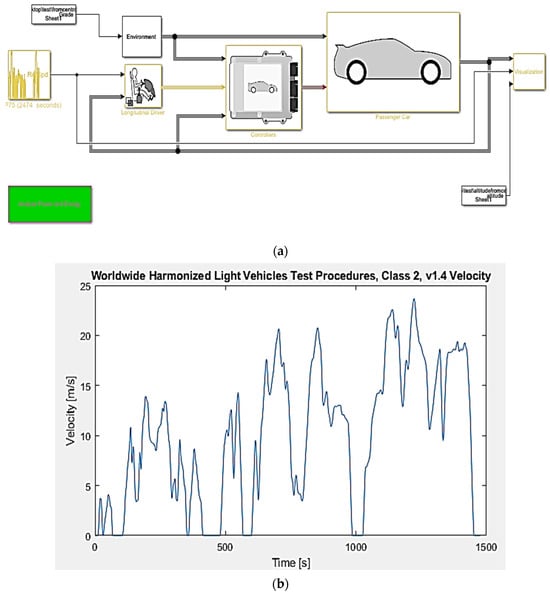 The simulation was executed using MATLAB (R2023b) and incorporated the fundamental model components of an EV, as depicted in Figure 6a. This model encompassed elements such as a battery controller section, a driving cycle selector, and environmental conditions considering the route elevation [15]. To simulate the effect of elevation changes, the road’s elevation profile was integrated into the model. Additionally, a World Harmonized Light Vehicle Test Procedure (WLTP) Class 2 driving cycle (as illustrated in Figure 6b) was employed, as it aligns with the maximum speed limit (90 km/h).