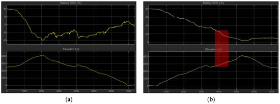 The simulations were conducted using MATLAB, considering both the outbound and return scenarios for each city. In all instances, an initial state of charge (SOC) of 80% of the electric vehicle’s battery was considered at the beginning of the journey.