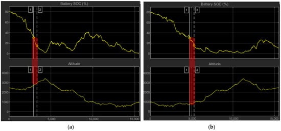 Considering an alternate route, such as Cuenca–Macas, it was observed that, during the outbound journey, the SOC reached a minimum of 2.4%. Similarly, while adhering to the safety margin for SOC between 15% and 30%, the viable options for charging station locations are constrained within the altitude range of 2500 to 2700 m above sea level. This altitude restriction ensures that electric vehicle users have accessible charging infrastructure for a secure and convenient travel experience along this route. On the other hand, when considering the return journey from Macas to Cuenca, it was observed that the minimum SOC reached was 8.2%. Consequently, a charging station is necessary within the altitude range of 780 to 910 m above sea level to ensure a reliable and efficient return trip for electric vehicle users (see Figure 9).
