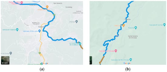 Charging station locations considering nearby tourist infrastructure: (a) Gualaceo; (b) Pupunas. Source: Google Maps.