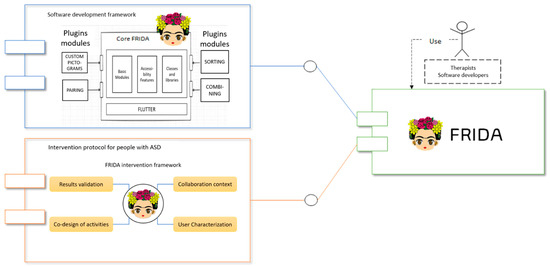 A component view (Figure 2) presents FRIDA as an agile design framework for accessible software aimed at people with ASD and as an intervention protocol for people with ASD using customized software designed based on each person’s requirements.