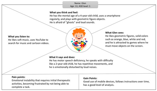The empathy map developed for one child with ASD, whom we call Glen (Figure 4), allowed us to identify the most relevant aspects of what he thinks and feels, what he hears, and what he observes, as well as his frustrations and identified positive aspects. For this study, all these aspects became elements that were considered during the design of the personalized software, which would be linked as an additional tool to the therapeutic process that was performed.