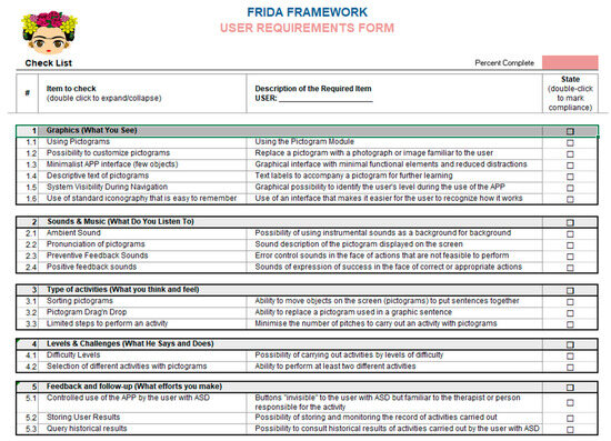 The definition of the elements identified above was written in natural language and was developed jointly by therapists, parents, and technology designers. The next step was to “translate” these elements into technical requirements so that they could be understood by software developers. To this end, a selection format (checklist) was developed (Figure 6) for the technical elements that should be considered when designing accessible software applications. This instrument was developed by the software analysts and collated with the interdisciplinary team (therapists and developers) before proceeding to the implementation of the app for each user.