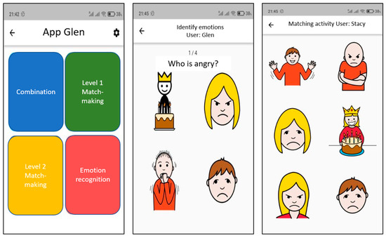 To this end, an additional session was held with two of the foundation’s children under the same criteria as the previous tests, that is, separately with each child, and in controlled spaces. The difference on this occasion was that, at the end of the activities using the personalized accessible apps, each child was asked to indicate how they felt and to express it with a facial expression or by pointing out their immediate emotion using the pictograms of the same application or a sheet of paper with the emotions drawn. As was evident at first glance, the results were favorable, corroborating the answers provided by the team of therapists.