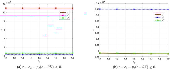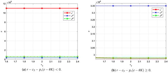 Next, keeping the remaining parameters as previously stated, We assume is 3. When , we set . From Figure 4a, we observe . Similarly, when a disruption occurs under the all-or-nothing condition, the manufacturer does not receive products from the unreliable supplier. Moreover, due to the excessively high carbon trading prices, the manufacturer no longer places orders with the backup supplier. This results in significant losses due to shortages, making the expected profit in this scenario the minimum. When , we set . In Figure 4b, we can see . This is because under the all-or-nothing condition, if the unreliable supplier experiences a disruption, he no longer supplies the manufacturer. With reduced production from the manufacturer, the carbon trading revenue increases. When demand information is updated perfectly, the manufacturer can make more precise orders to reduce order shortage costs.
