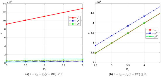 We analyze the impact of on the expected profits under the three scenarios. Keeping the remaining parameters as previously stated, we assume is 2.5. When , we set . From Figure 5a, we observe that , , and all increase with the increase of . This is because the increase in carbon trading price leads to a reduction in the manufacturer’s order quantity. However, reducing the order quantity can result in more carbon trading revenue. Additionally, still exists. Due to the disruption when the all-or-nothing condition is in place, the manufacturer cannot receive products from the unreliable supplier. Furthermore, due to excessively high carbon trading prices, the manufacturer no longer places orders with the backup supplier. This results in substantial losses due to shortages, making the expected profit in this scenario the minimum. When , we set . In Figure 5b, we can see that , , and all increase with the increase of . The reasons behind this result are the same as when . Similarly, still exists in this situation.