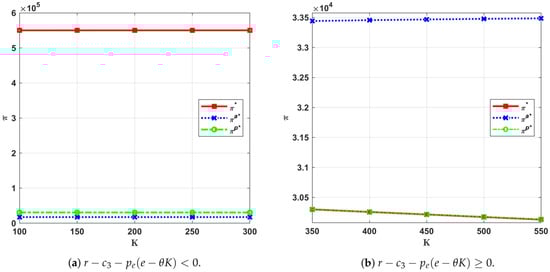 Finally, we analyze the impact of K on the expected profits under the three scenarios. Keeping the other parameters as previously stated, assuming is 2.5 and is 3. When is satisfied, we let . From Figure 6a, we observe that , , and all increase with the increment of K. This is because the increase in green investment leads to a reduction in carbon emission costs per unit product, resulting in more revenue from the carbon cap-and-trade system. Additionally, exists for the same reasons mentioned earlier. When a disruption occurs under the all-or-nothing condition, the manufacturer cannot receive goods from the unreliable supplier, and due to excessively high carbon trading prices, the manufacturer no longer places orders with the backup supplier, resulting in significant losses due to shortages, making the expected profit in this scenario the minimum. When is satisfied, we let . From Figure 6b, we observe that increases with the increase in K, while and decrease with the increase in K. This is because, under the all-or-nothing condition, when a disruption occurs with the unreliable supplier, it cannot provide products. However, due to the increase in green investment, the carbon trading revenue per unit product increases. At this point, carbon trading revenue under the all-or-nothing condition is sufficient to offset the losses from shortages. Therefore, increases with the increase in K. However, for the other two scenarios, since the unreliable supplier can provide a partial order quantity, ordering costs must be paid to the unreliable supplier. However, the incurred ordering costs will exceed the revenue from carbon trading, so and decrease with the increase in K. Similar to the previous cases, still exists.